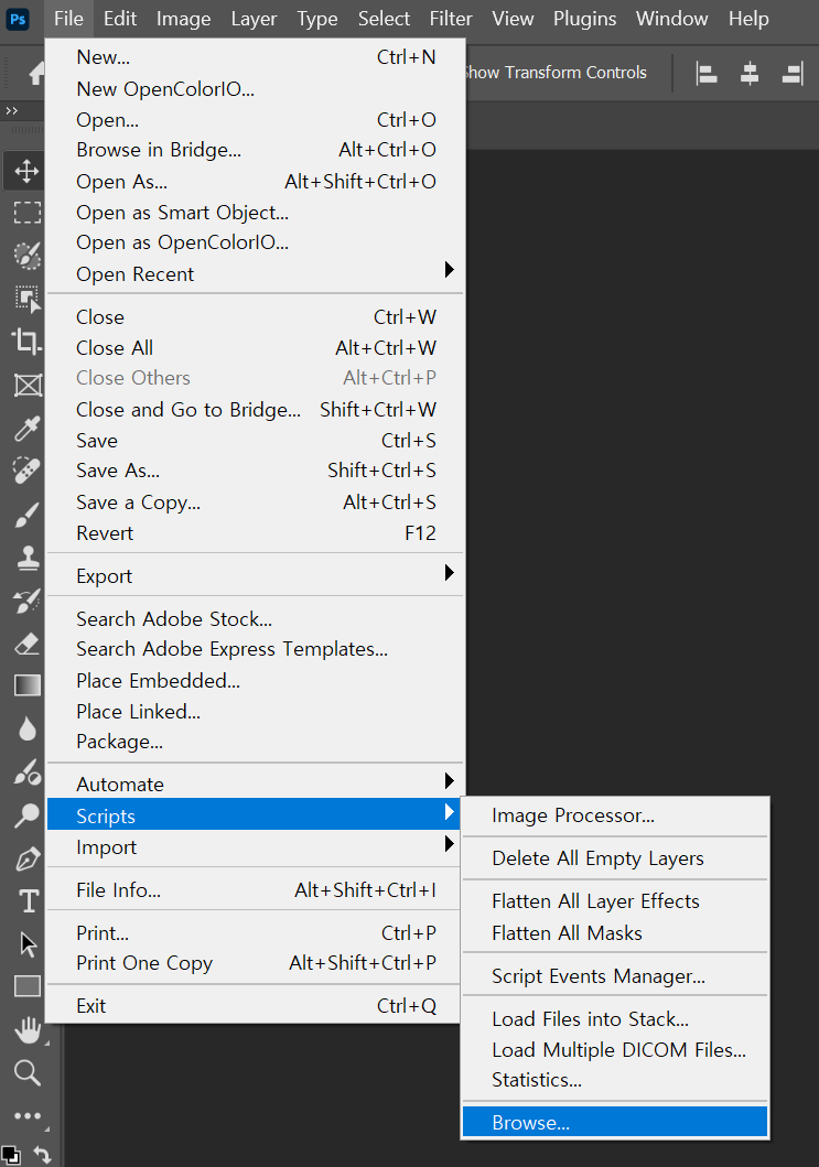 실행은 포토샵에서 스크립트 파일을 선택하는 것으로 하는 것입니다.