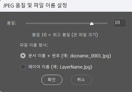 파일 이름은 레이어의 이름을 그대로 따를 수도 있고 현재 포토샵 파일명에 순서대로 번호가 붙게끔 저장할 수 있습니다.