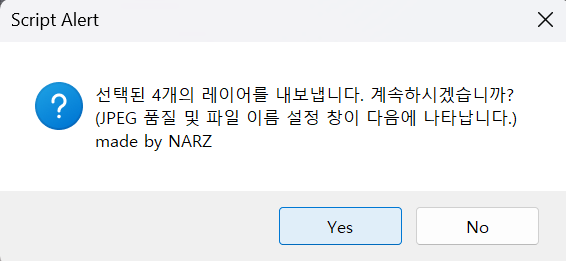 - 스크립트가 저장 작업을 다 마친후 이전에 선택했던 레이어들을 다시 선택된 상태로 바꿔주기 때문에 저장된 이미지 파일들의 상태를 확인하고 필요시 재작업을 하기 좋게 되어있습니다.